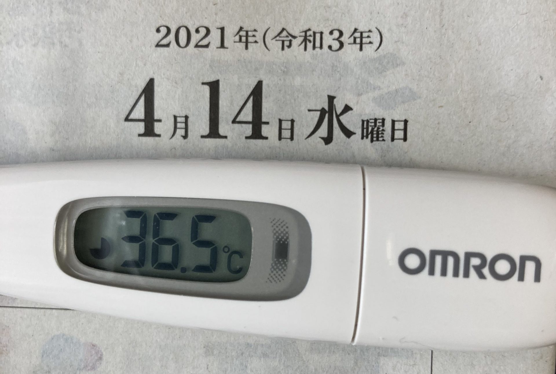 2021年4月14日(水)【体温】 36.5℃(平熱36.5℃)【症状】頭痛、咳、喉の痛み、味覚障害なし【体調】本日は平熱です。体調も良好です。