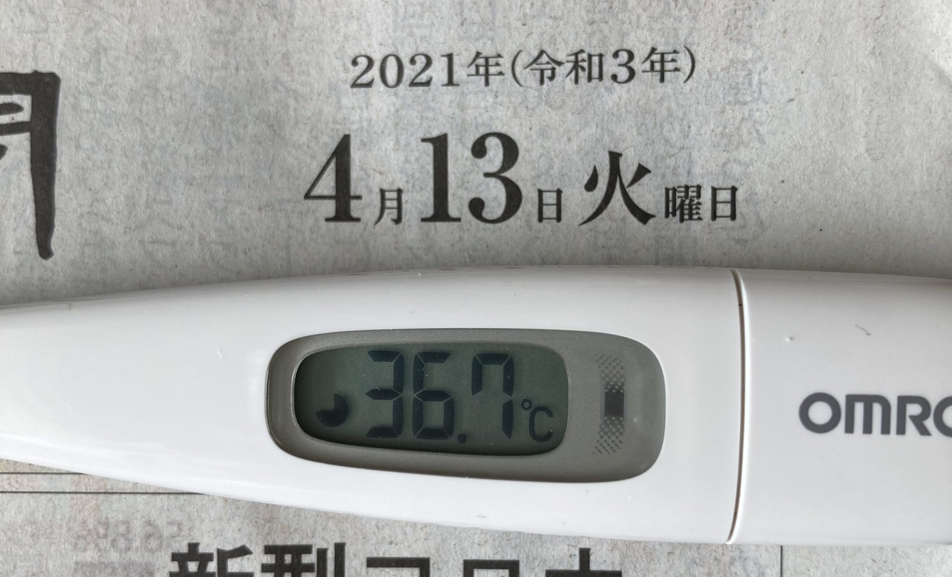 2021年4月13日(火)【体温】 36.7℃(平熱36.5℃)【症状】頭痛、咳、喉の痛み、味覚障害なし【体調】本日は平熱よりやや高めですが、体調は良好です。