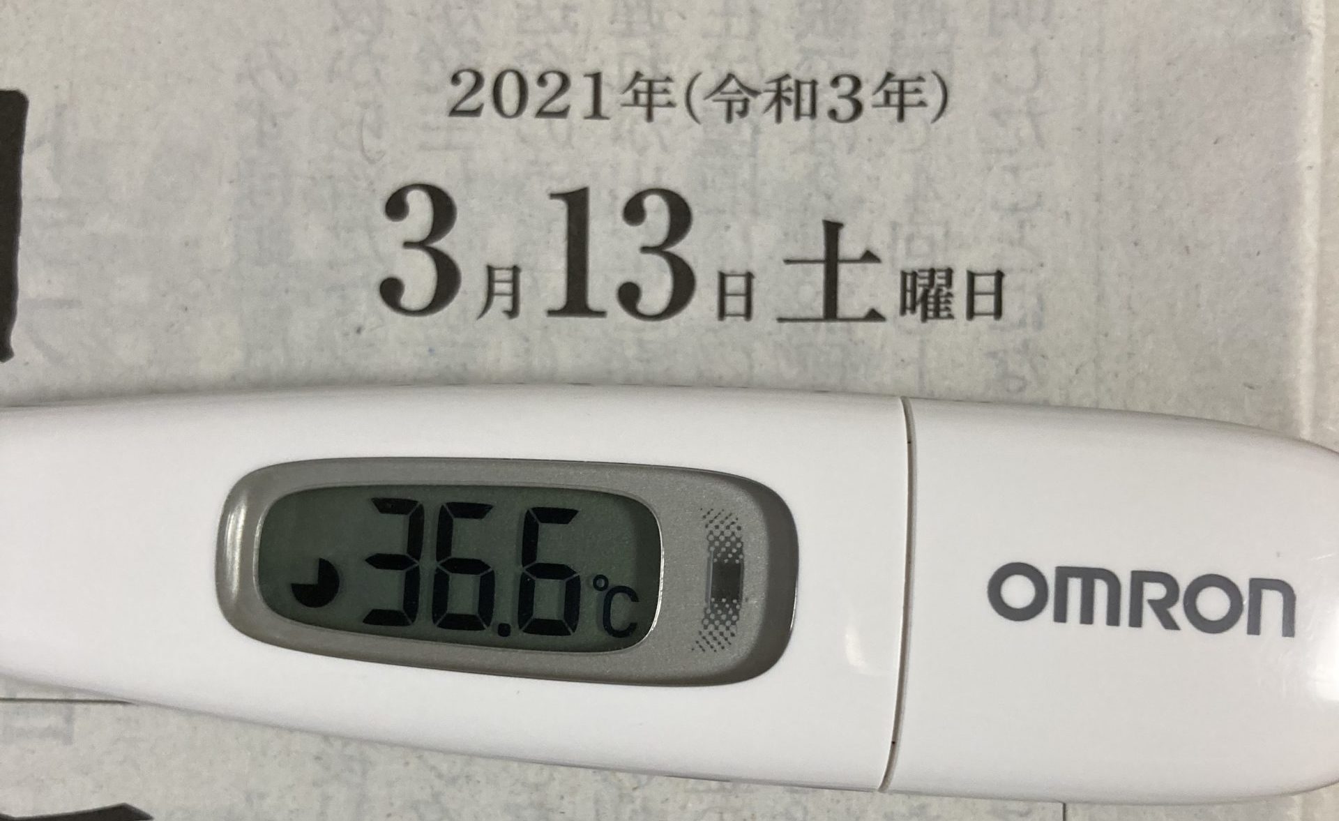 2021年3月13日(土)【体温】 36.6℃(平熱36.5℃)【症状】頭痛、咳、喉の痛み、味覚障害なし【体調】本日はほぼ平熱。体調は良好です。