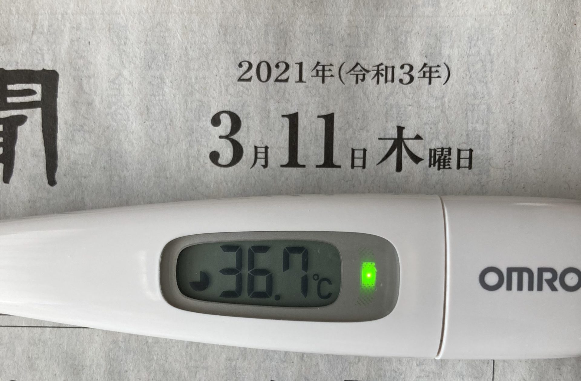 2021年3月11日(木)【体温】 36.7℃(平熱36.5℃)【症状】頭痛、咳、喉の痛み、味覚障害なし 花粉症によるくしゃみ、鼻水はあり【体調】本日は少し体温高めですが、体調は良好です。